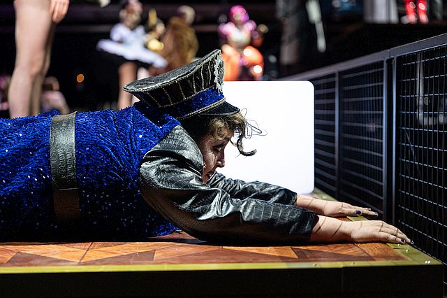 Der von Marco Zeiser Celesti einstudierte Chor des Staatstheaters Kassel singt weit verteilt auf der großen Bühnenfläche intensiv und ist szenisch stark eingebunden. Die Sänger:innen des Chors sind durchgehend schwarz gekleidet, meist mit frivoler Note, manche zusätzlich mit ausgefallenen Kopfbedeckungen oder eng anliegenden Kappen.
