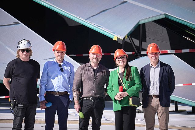 v.l.n.r.: Sami Kyllönen (Seebühnenmeister), Arno Reisch (Geschäftsführer REISCH Maschinenbau), Paolo Fantin (Bühnenbildner), Lilli Paasikivi (Intendantin), Wolfgang Urstadt (Technikdirektor)