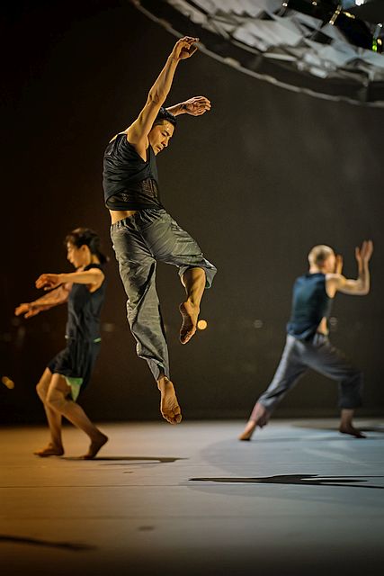 Unter diesem Objekt sorgen im ansonsten weiten und leeren Raum die sechs Tänzerinnen (Eden Beckerman, Mathilde Belin, Sayaka Kado, Bridget Lee, Milica Mučibabić und Vanessa Shield) und die sechs Tänzer (Peng Chen, Ramon John, Masayoshi Katori, Anthony Michael Pucci, Luke Watson und Benjamin Wilson) für viel Bewegung und anmutige Optiken. Die ruhig und mehr oder weniger sanft dahinfließenden Klänge werden von Ihnen gewissermaßen konterkariert. Mit hohem Tempo treten sie in eine Interaktion und zeigen dabei ihre intensive Körperbeherrschung. Bei den wenigen expressiven musikalischen Momenten hingegen verharren sie (mit großer Präsenz).