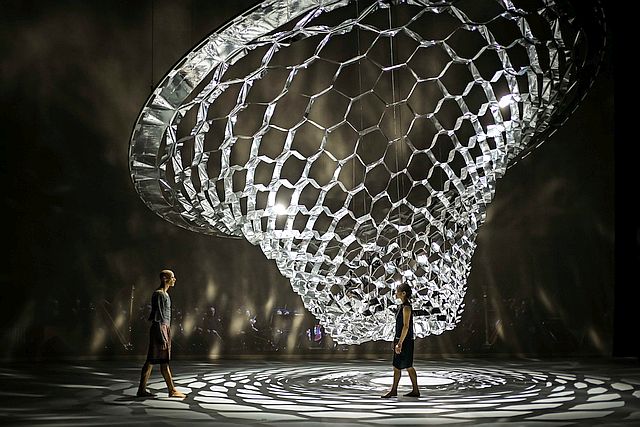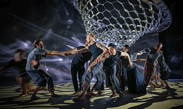 Tanz, Bühnenbild und Orchesterklänge bilden bei „Become Ocean“ eine beeindruckende Symbiose mit einer sogartigen Wirkung. Im Mittelpunkt schwebt ein großer Kunstkörper. Mit seiner Wabenstruktur spielt es vage auf ein Meereswesen, wie eine Qualle, an. Oder ist es ein von Menschen geschaffener Fremdkörper? Anfangs noch auf dem (Meeres-)Grund stehend, erhebt er sich und wird in verschiedenen Positionen und Ausleuchtungen gezeigt. Dabei wirkt er stets sehr erhaben, wirft Schatten und spiegelt Lichtstrahlen (Bühnenbild: Yoko Seyama; Lichtdesign: Joanne Shyue). Zum Schluss sinkt er in sich zusammen und wird eins mit dem Meer, das die Herrschaft über die Welt zurückerobert hat.