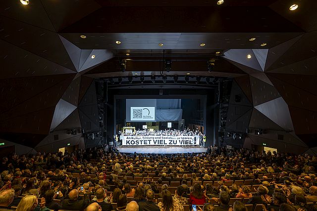 Im Anschluss an die gestrige Premiere von William Shakespeares Hamlet, inszeniert von Schauspiel-Intendant Burkhard C. Kosminski, übernahmen Stuttgarter Kulturschaffende aus allen Institutionen und Bereichen die Bühne des Schauspielhauses, um als Bündnis Stuttgarter Kultur gemeinsam gegen die geplanten drastischen Kürzungen in den Bereichen Kultur, Bildung und Soziales zu demonstrieren.