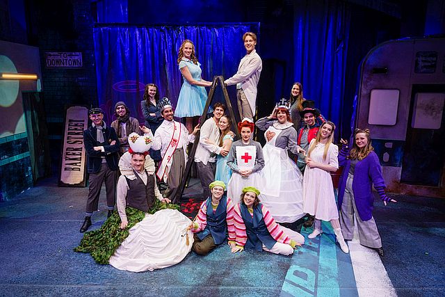 Mit nur zehn Darsteller:innen ist „Alice by Heart“ für das Junge Staatsmusical Wiesbaden eine eher kleine Produktion, sind sonst doch meist mindestens doppelt so viele auf der Bühne beteiligt (wobei es für viele Partien eine zweite Besetzung gibt). An Aufwand wurde aber nicht gespart. Die Bühne in der Spielstätte Wartburg zeigt einen Ausschnitt der Londoner „Baker Street“-Underground-Station mit Backsteinwänden. Mitsamt einer Rückansicht eines Underground-Wagens, dem Bahnsteighinweis „Mind the gap“ und einigen Feldbetten (Bühnenbild: Britta Lammers). Farbenfroh sind die zahlreichen Figuren in Alices Traumwelt gestaltet (Kostüme: Heike Korn). Eine weitere Besonderheit dieser Produktion ist, dass das Stück in kompakten 90 Minuten ohne Pause gespielt wird.