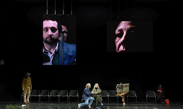 Das Geschehen spielt im Warteraum einer Polizeistation, in der die Eltern gerade den Mord gemeldet haben. Nun versuchen sie, irgendwie mit der Situation klarzukommen, dass ein eigenes Kind zum Mörder wurde. Es ist ein von drei Neonröhren ausgeleuchteter Raum mit schwarzen Wänden, 15 Stühlen, einem Wasserspender und einer Wanduhr, die konstant fünf vor zwölf anzeigt (Bühne: Sarah Wolters). Je mehr sich der Abend verdichtet, umso dunkler wird es auf der Bühne, womit gleichzeitig ein Übergang zum nachfolgenden Werk geschaffen wird.