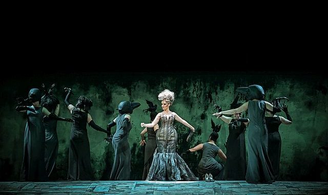 Anfangs herrscht eine gewisse Schwarz-Weiß-Optik, die Figuren erinnern ob ihrer Kleidung und zerfahrenen Haarpracht ein wenig an die Mitglieder der „Addams Family“. Die verschiedenartigen Kostüme von Sandra Münchow weisen auf die Entstehungszeit hin, spielen aber auch mit viel Glitzer und Federboas auf die Gegenwart an. Neben einem Löwentrio in goldglänzenden Bodysuits, agiert hier zusätzlich ein mysteriös und androgyn anmutender Mann, mit langen grauen Haaren in einem Tüllkleid und auf Kohorten laufend, als stiller Begleiter (Statisterie).