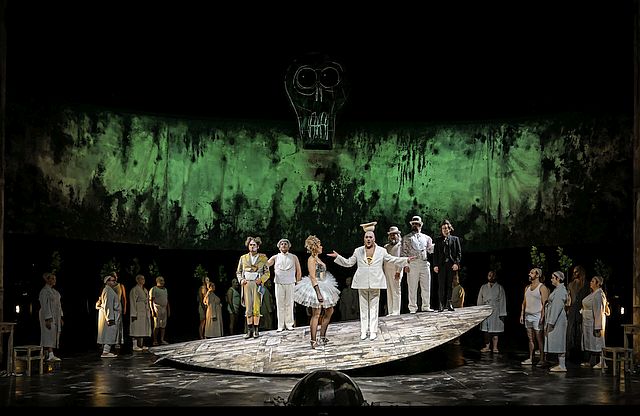 Im Mittelpunkt, quasi als Weltenscheibe, steht ein wippenförmiges Konstrukt. Es ist ein rundes, gebogenes Podest, das horizontal gekippt werden kann (zudem fahren durch eine Öffnung Figuren auf und ab). Die gesamte Bühne ist von einem Bühnenrahmen umgeben, wie auch mehrfach Bühnenfronten vom Schnürboden herabgelassen oder auf den Händen getragen werden. Ein großer Korb mit den auf alt getrimmten drei Knaben (vom Mainzer Domchor) und ein Ballon im Totenschädelformat schweben eindrucksvoll durch die Szenerie. Als Wertschätzung zum Werk werden mehrfach Teile der Partitur auf Vorhänge projiziert (Bühne: Peter Engel).