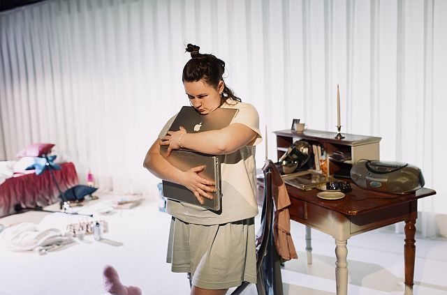 Die Bühne von Swenja Trebeljahr zeigt hierfür ein unaufgeräumtes Zimmer, in dem die junge Frau lebt. Es ist mit nostalgisch anmutenden Gegenständen eingerichtet, die konträr zum Alter der Protagonistin wirken. Sie selbst trägt kurze Loungeware (Kostüme: Henrike Reller). Ein weißer Boden und weiße Vorhänge im Hintergrund vermitteln eine gewisse Künstlichkeit, so als würde man als Zuschauer in ein Versuchslabor blicken. Die Antworten der KI /des Webs werden zugespielt, wie auch die sich steigernden Sounds (Musik: Lucas Lejeune).