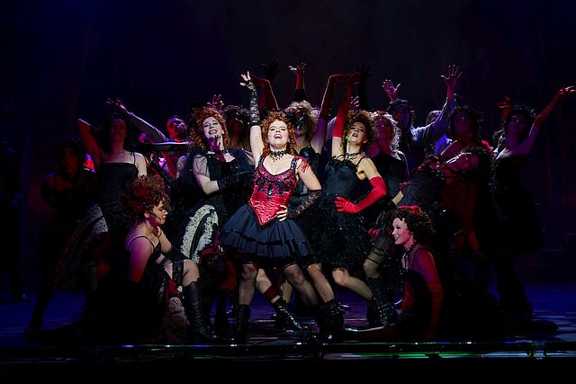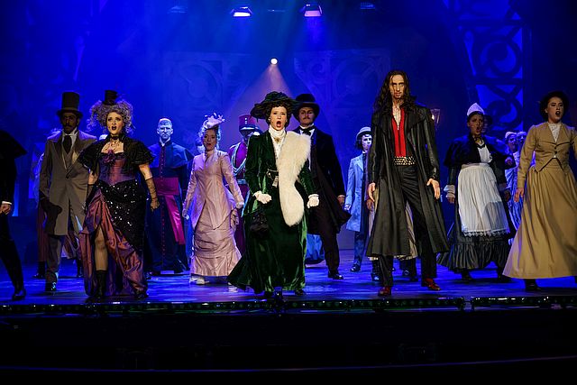 vorne v. l. n. r. : Nellie (Katharina Hoffmann)Lady Beaconsfield (Viktoria Reese), Spider (Linus Weinbrenner) und Ensemble