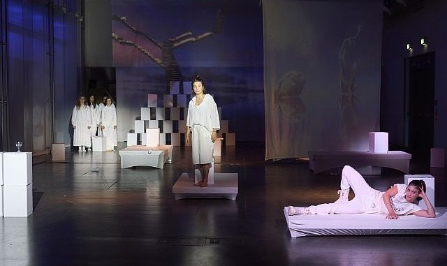 In einer 3-D-Videoanimation lässt Pola Sell das Bühnengeschehen auf surreale Weise erlebbar werden. Mit ihrer für die Theaterperformance komponierten elektronischen Musik erschafft Louisa Beck einen Soundraum mit ganz eigener Klangwelt.