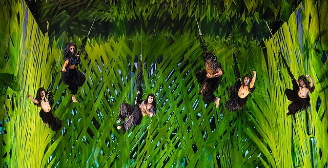 Trotz eines zunächst eher schlicht und leer erscheinenden grünen Grundraums sind die visuellen Eindrücke überwältigend. Zumal sich die Bühne als fast undurchdringlicher Dschungel durchaus vielseitig erweist. Das liegt an vielen Elementen, nicht nur an der Videorückwand mit ihren Stimmungsbildern (Video-Design: George Reeve). Die aufwendigen Kostüme erinnern teilweise an die Detailverliebtheit vom Cirque du Soleil. Die Gorillas und der Leopard sind stilisierte, keine naturgetreuen, Nachbildungen.
