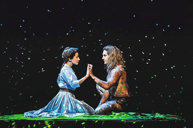 Gleiches gilt auch für manche Requisiten. Ganz besonders verzaubern die fluoreszierenden Pflanzen und Schmetterlinge, wenn Jane den Urwald erkundet (Song „Auf diesen Tag hab’ ich gewartet“; Regie, Bühnenbild und Kostümdesign: Bob Crowley). Aber auch kleine Szenen, wie die von Goldglitzer-Effekten begleitete Verwandlung des Baby-Tarzans zum jungen Tarzan.