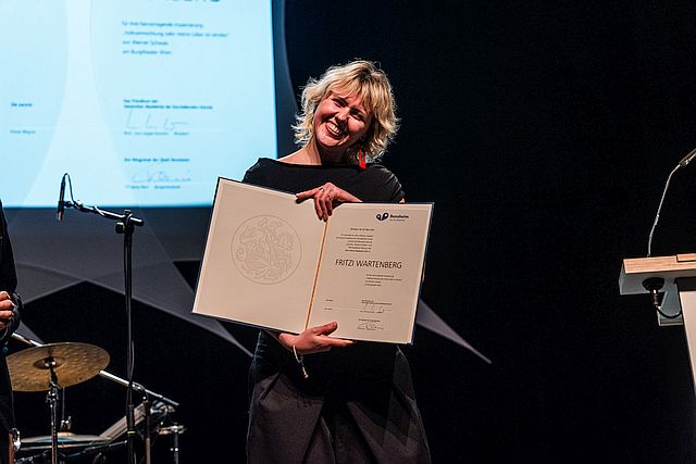 Sichtlich überwältigt von den Worten ihrer Laudatorin betonte die junge Theatermacherin das Privileg, „Dinge machen zu dürfen, bei denen man nicht weiß, was dabei herauskommt“. Sie sei stolz, an einem „Haus mit all den Profis arbeiten zu dürfen, die ihr diese Freiheit ermöglichen“, so Fritzi Wartenberg. Ihr Dank galt allen Wegbegleiterinnen und Wegbegleitern und besonders ihrer Schwester, „ohne die ich hier nicht stehen würde“.